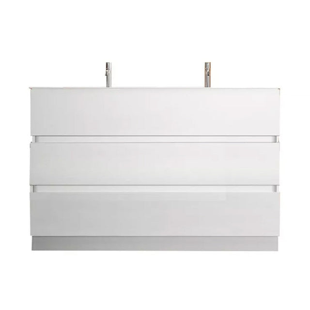 Le meuble mesure 122 cm de largeur, 47 cm de profondeur et 86 cm de hauteur. Il est conçu en bois avec une finition blanc brillant et intègre un plan vasque double en céramique.