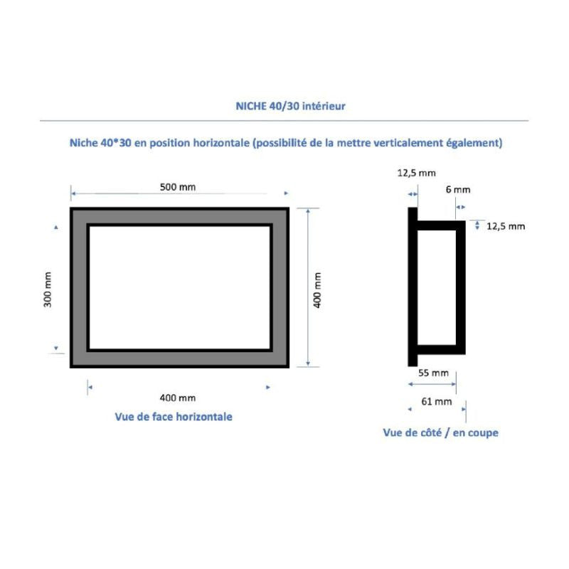 Caractéristiques techniques Duo de niches à carreler étanche MARMOX DUONICHE40/30-INT - Format intérieur 40x30cm - Profondeur 6cm