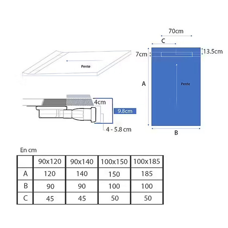 Densité 36 kgs/m3 / Résistance à la compression: 3 tonnes par m2 / Comportement au feu: Classe E / Léger / Extra-plat (40 mm) / Finition caniveau / Recoupable / Modèle mono pente spécial grands carreaux / Polystyrène extrudé renforcée avec de la fibre de verre et du mortier polymérisé étanche / Natte étanche pré-montée qui dépasse de 10 cm de chaque côté pour relevé périphérique / Résistance mécanique renforcée / Compatible tous carreaux / Garantit contre le poiconnement / Grille caniveau excentrée / Format de la grille 70 cm par 7 cm / Ajustement de la hauteur de la grille en fonction de la hauteur du carrelage / Evacuation des eaux infiltrées / Garantie 10 ans / Siphon ultra plat / Sortie du siphon 40 mm / Débit 34 litres par minute / Compatible avec grille à carreler sur demande