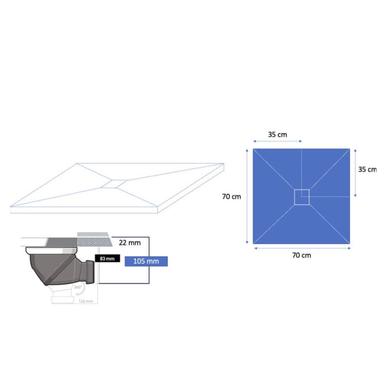 Produit professionnel / Garantie 10 ans / Résine acrylique modifiée avec gel coat / Natte étanche pré-montée pour étanchéité périphérique / Antidérapant PN 24 (Classe C) / Antibactérien / Résistant / Recoupable avec un disque diamant / Léger / Grille acier inox dans la même couleur que le receveur / Format de la grille 11,5 x 11,5 cm / Siphon NF à 360° vertical horizontal ou siphon ultra plat horizontal sur demande / Débit supérieur à 32 litMAR par minute / Diamètre de sortie: 40 mm / Nettoyable avec tous types de détergents / Emballage renforcé / Rapide à poser / Pose à encastrer ou surélevé ou à poser