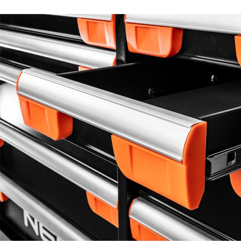 Le plateau en aluminium avec des espaces pour les tournevis et les accessoires, ainsi que la perforation latérale avec un espace pour les crochets et les produits de la marque NEO, étendent la gamme d'utilisation de l'armoire. Des butoirs d'angle, une poignée latérale et une serrure de tiroir s'avèrent également utiles. Les glissières à billes et la possibilité d'ouvrir les tiroirs à 100% permettent une utilisation confortable de l'armoire.